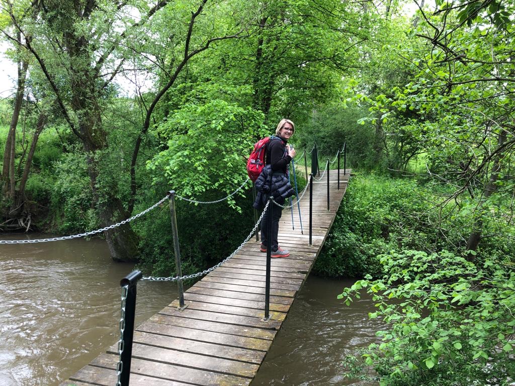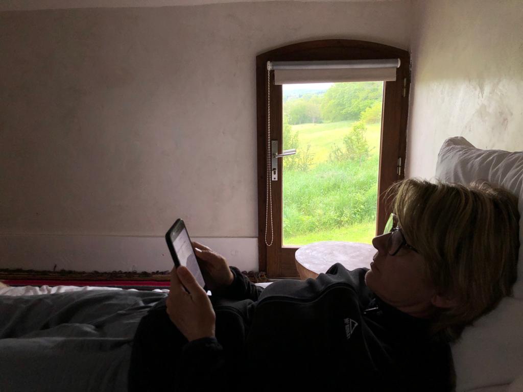 Planté au milieu des champs et au sommet d’un beau sentier cassant, nous trouvons notre gîte atypique de La Motte, étape du jour. Didier nous fait découvrir une toute petite maison qui se trouve être l’ancienne fromagerie (super, tu compatis Anne-Françoise ? moi, me faire dormir dans une fromagerie. Faut vraiment que je l’aime ma Sophie 🥰). Bon ça va, il n’y a plus d’odeur. Mais il y a des toilettes sèches. Encore une expérience de plus à mettre au compteur ! La vue depuis le lit sur l’abbaye de Bénissons-Dieu au loin est magnifique.
