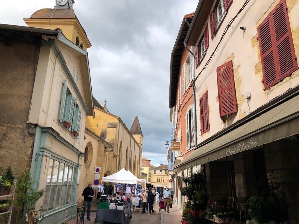 Nous partons de Charlieu avec son centre ville classé après un passage au marché pour le picnic du midi. Tout nous fait envie mais la raison du poids à transporter est plus forte que l’envie. Nous abandonnons même l’idée d’acheter une Praluline de 300gr (ça ne parait rien 300gr hein ?). Comme il s’agit d’une étape de plaine sur des pistes cyclables bitumées, nous avançons à un rythme rapide, inconnu depuis le départ de Cluny. Forcément, c’est tout plat car nous sommes dans la vallée de la Loire.