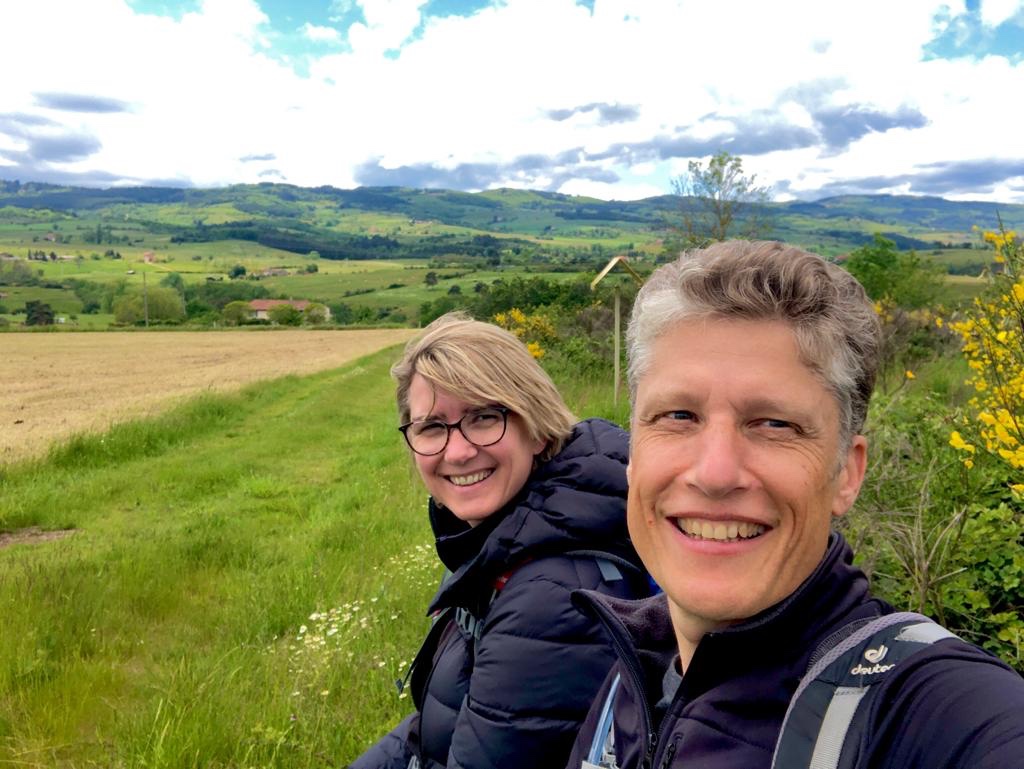 Nous retrouvons un couple de marcheurs à l’étape. Ce sont de grands experts par rapport à nous : ils ont déjà fait Le Puy-Compostelle et entament le tronçon qui leur manquait. Mais ils sont partis d’un poil plus loin : ils ont pris la route il y a trois semaines de Montbéliard en direction du Puy. En discutant autour d’un rosé du Rouannais, nous apprenons qu’ils ont aussi fait le Chemin d’Assise et un autre en Suisse. Elizabeth nous dit que lorsque l’on en a fait un, c’est comme une évidence d’en faire d’autres.