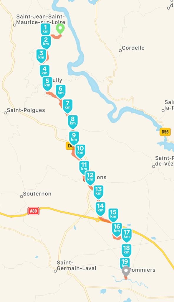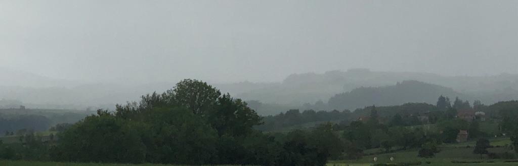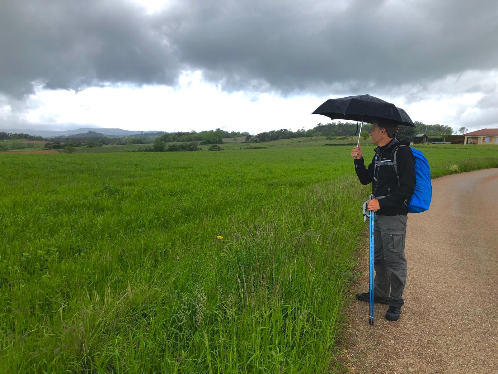 Entre plusieurs grosses averses, dont l’une nous oblige à nous abriter sous le porche d’une église, la bonne étoile du pèlerin nous donne une éclaircie pour déjeuner au soleil. La descente est beaucoup moins bucolique puisque nous longeons l’autoroute A89 pendant 1km avant de passer dessous. 😤 Soyons positifs et prenons ça comme la frontière de notre mi-parcours.