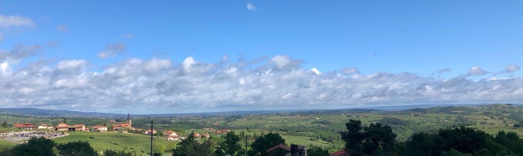 Le Chemin de crête de la fin du Rouannais est superbe car il surplombe le massif des coteaux du Lyonnais à gauche avec la Loire au fond, à droite la vallée qui mène à Vichy et en face le Forez qui nous mènera au Puy. On tombe sur une maison toute moderne perdu au milieu de ce massif et qui a ce panorama comme jardin. Ça nous irait bien pour les vacances.