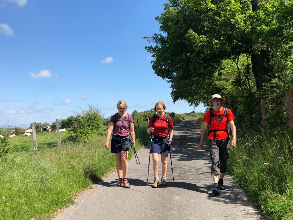 Après une liaison de plaine (encore 😤), nous attaquons enfin une belle colline qui nous permet d’atteindre le sommet du coin. Cela fait du bien de se dérouiller les guiboles ! Et puis le paysage est vraiment plus beau d’en haut. Comme l’étape est toute courte ce jeudi, nous arrivons assez tôt à notre destination.