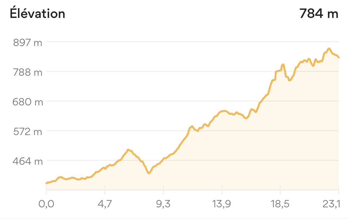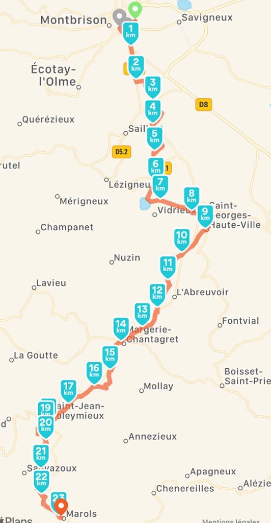 Quelle étape ! Moi qui voulais monter. Je suis servi ! Depuis Montbrison, sur les sept heures de marche, nous avons fait six heures de montée avec un dénivelé qui nous a bien cassé les jambes. Mais nous sommes contents car nous venons de dépasser les 220 km de marche. Mine de rien, cela commence à faire une belle « promenade » depuis Cluny.