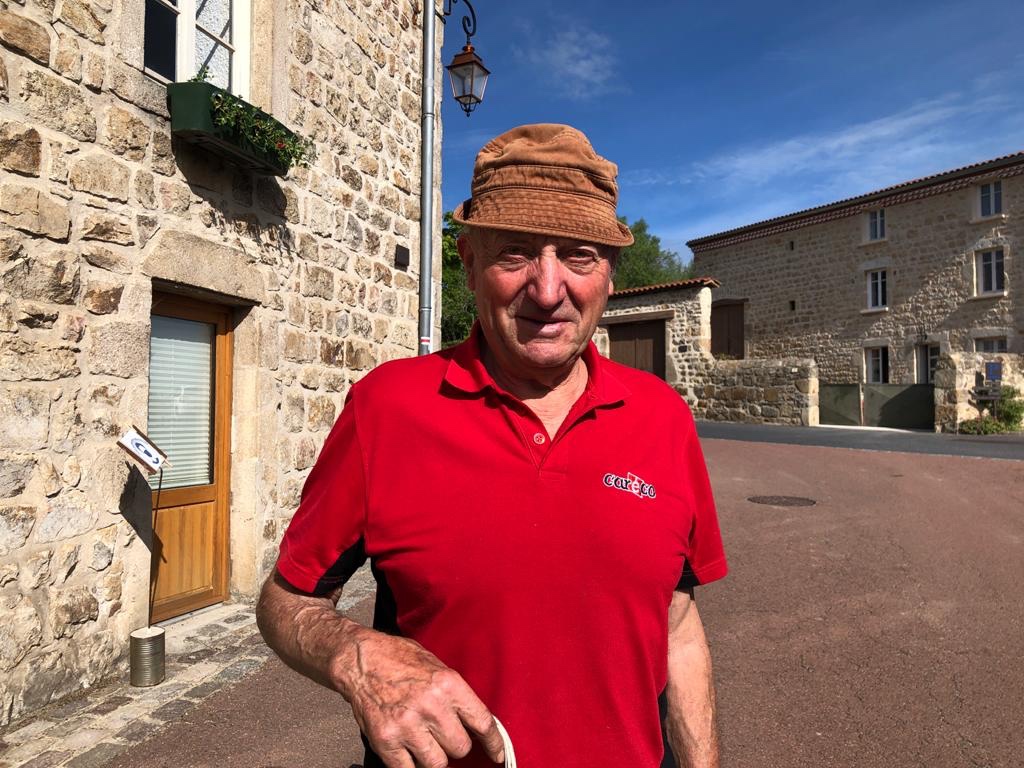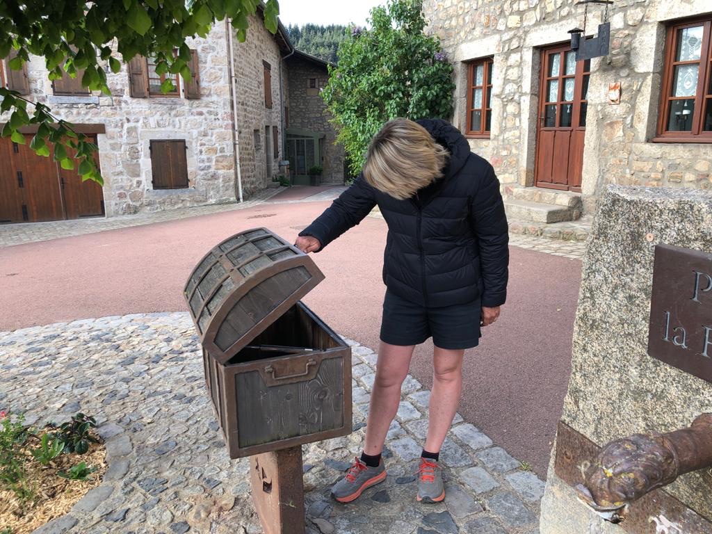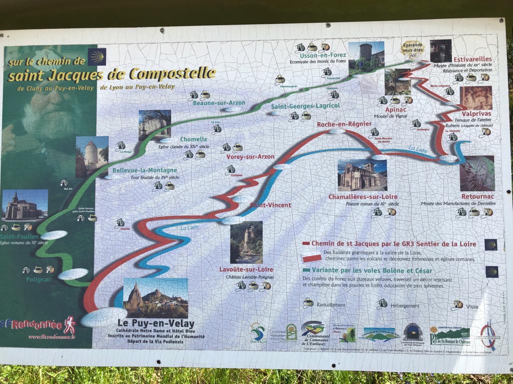 Avant d’entamer la dernière longueur vers Leignec, nous passons par Apinac qui se trouve être le village d’enfance du grand chef Pierre Gagnaire. Dans un dernier effort et une belle suée, nous arrivons au gîte des Charmilles accueillis par nos hôtes. Je demande directement à Jean-Claude pourquoi il n’y a plus de coquilles officielles pour nous guider. Piqué au vif, il répond «vous les avez vu les coquilles peintes en bleu ? ». Nous lui répondons que oui, il est soulagé et nous raconte l’histoire avec son accent local. En pratique, il y a la guéguerre du Chemin. L’ouest (pas le nôtre) est estampillé avec les étiquettes classiques car géré par l’association de St Jacques de Compostelle de la Loire. Il se trouve que le président et sa sœur ont chacun un gîte sur l’itinéraire. Ils orientent donc les pèlerins vers la route ouest qui n’est pourtant pas l’officielle et historique. C’est une variante mais bien la source de leurs revenus. Pas très charité chrétienne tout ça 🧐. Du coup, le Chemin « est » que nous empruntons a été balisé par notre hôte avec ses coquilles peintes en bleu qu’il se fait régulièrement casser par le gars de l’ouest. C’est Ok Corral ici !