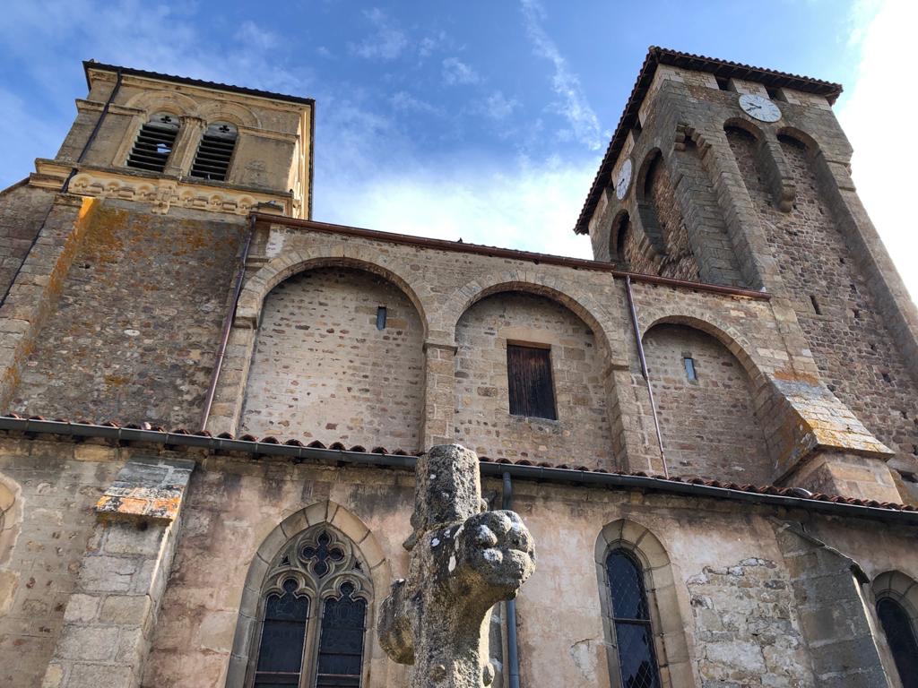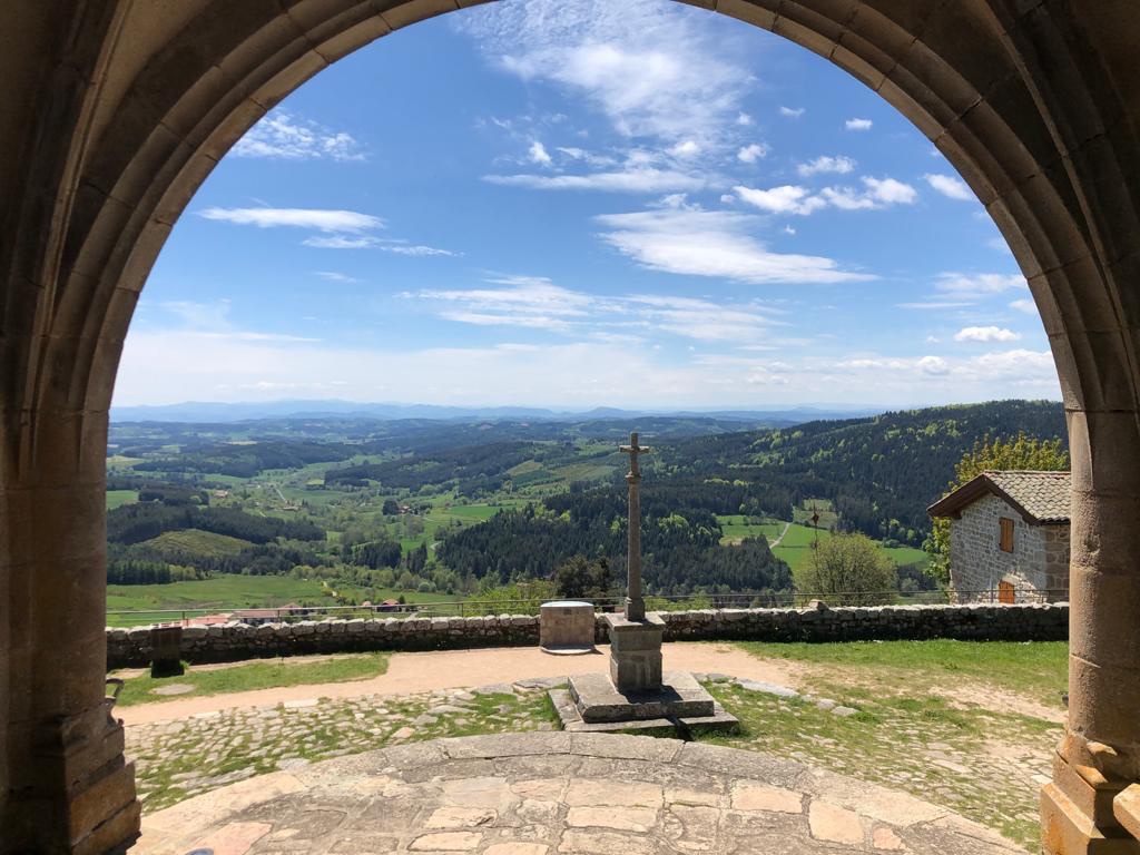 Un peu plus tard que prévu sur le planning, nous quittons donc Marols pour une étape estimée de 17km avec comme seule difficulté l’ascension à 1160m. Euh, comment dire que cette étape s’est révélée bien plus difficile qu’estimée. Les 17km se sont transformés en 23 et avec un dénivelé négatif très fort. Aucun doute : je me suis trompé dans le calcul du routage. Les genoux ont pris mais surtout les talons de Sophie qui la font souffrir de plus en plus. Les 5 derniers kilomètres sont un calvaire. D’autant plus que Leignec, notre étape du soir est sur un piton rocheux qu’il nous faut gravir une nouvelle fois. Notre Chemin a commencé en balade, est devenu une marche et se finit en épreuve. Puiser dans nos ressources mentales et physiques, c’est le sens de ce pèlerinage aussi. On le savait avant de partir.