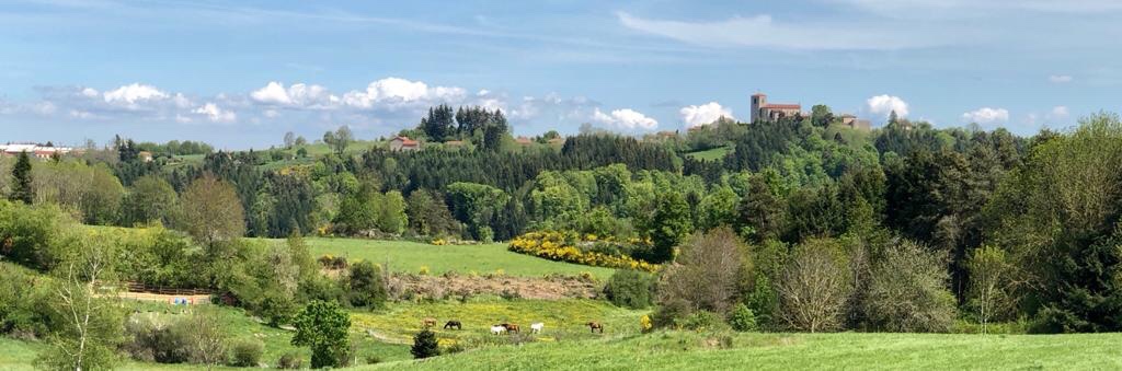 Pour revenir à la « promenade » du jour, nous avons découvert des paysages incroyables. Comme nous avons attaqué la descente par le village de caractère de Montarcher (encore un de plus après Marols). Plus haut village de la Loire à 1100m d’altitude, il domine toute la vallée de la Haute Loire. Quel panorama ! Nous déjeunons sur une table de picnic seuls au monde face à cette immensité. Nous sommes heureux. Par contre, le vent très frais nous refroidit. Le coin est tellement frisquet que même le seigneur au moyen-âge décide de se faire construire un autre château dans la vallée, plus abrité du vent. Son nouveau domicile est aujourd’hui un domaine privé magnifique près d’Estivareille.