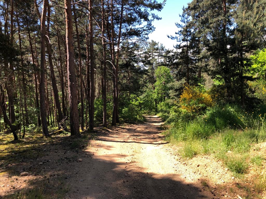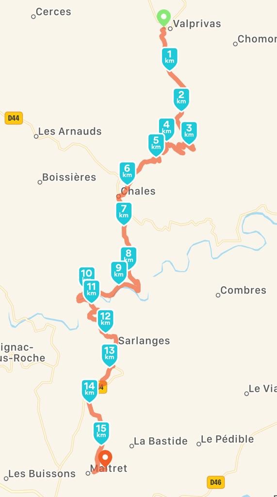 Et c’est là que les choses sérieuses ont commencée. La descente dans la deuxième vallée a été entamée de façon assez classique. Nous avons même pensé que nous étions en Provence avec ses pins et son chemin de couleur orangé. Et tout d’un coup la descente s’est transformée en un mur très vertical. Exactement ce qu’adore Sophie. 250m de descente très pentue. Que des blocs de pierres, des racines et des éboulis. Sophie a de nouveau dépassé ses limites. Elle l’a fait une fois : il va falloir qu’elle le refasse sur les deux prochaines étapes vu les descentes prévues d’ici Le Puy ! 😍
