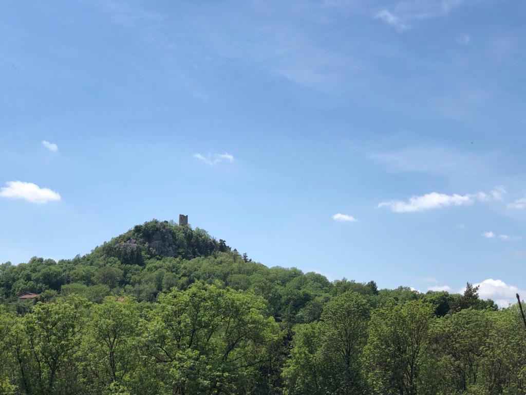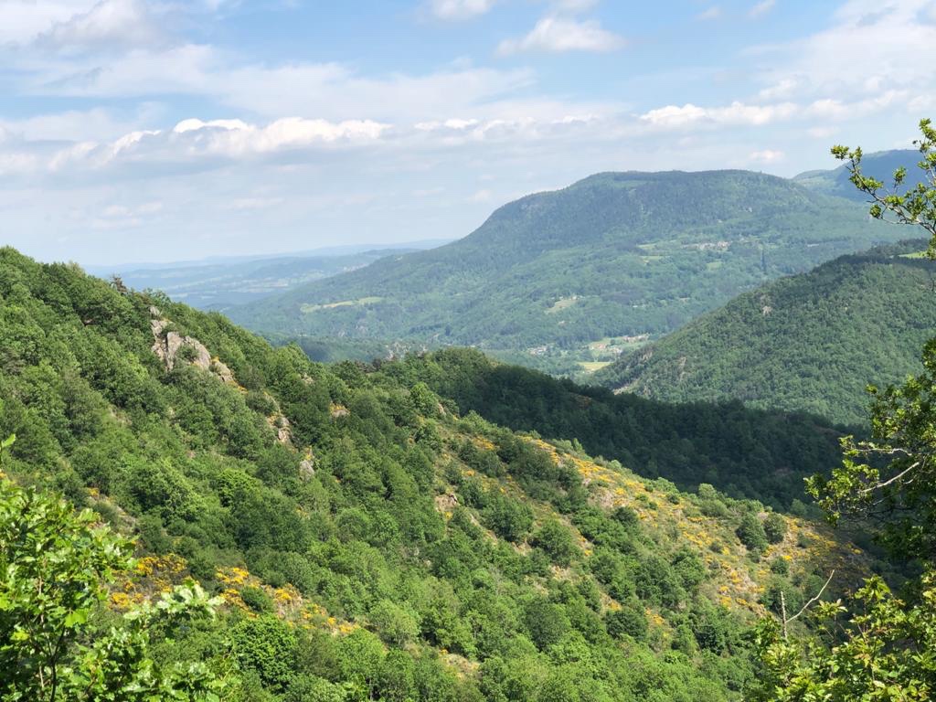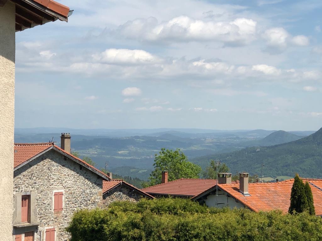 Le sommet est en fait une vaste plateau occupé par des champs et des prés avec quelques hameaux et fermes. Ce n’est pas du tout le paysage auquel nous nous attendions. Nous parcourons cet espace en passant par le village de la Roche-en–Régnier. Panorama à plus de 180° sur les montagnes et sucs environnants. C’est époustouflant ! Dommage que le temps soit un peu brumeux : les photos ne rendent pas ce que les yeux voient.
