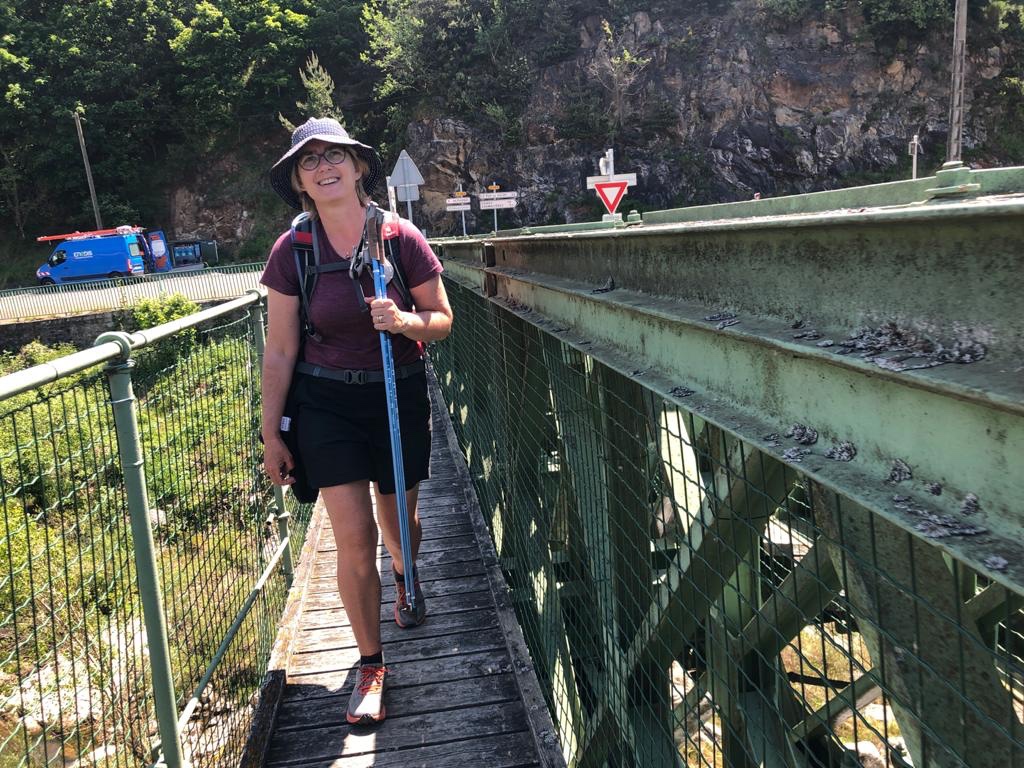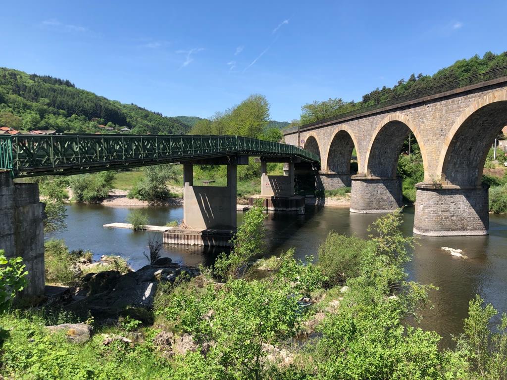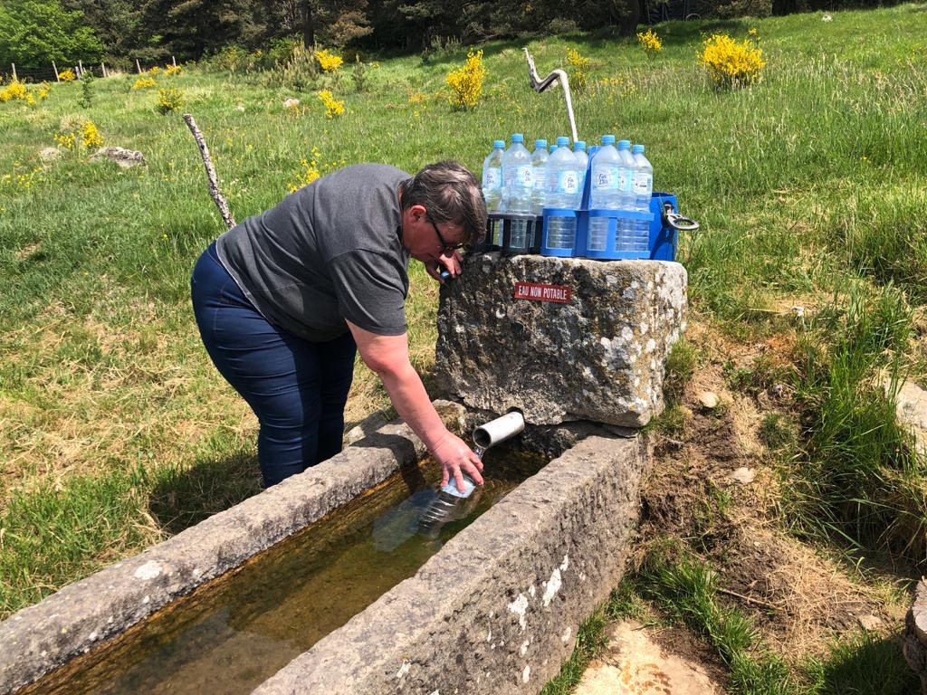 Pour la deuxième fois depuis le début de notre périple, nous passons la Loire. Et aujourd’hui c’est deux fois de suite. le dernier pont ressemble d’ailleurs plus à celui de la rivière Kwai qu’à un passage réglementaire. On s’est dit qu’il fallait mieux faire la pause casse-croûte en bas pour prendre des forces avant d’attaquer la montée. Bien nous en a pris car on s’est fait 700 m de dénivelé positif pendant deux heures. Arrivés à un hameau de trois maisons, nous demandons à une dame si on peut remplir les gourdes. Elle nous dit très gentiment « non » et nous suggère de remplir à l’eau de source au-dessus de laquelle figure un panneau « eau non potable ». Nous décidons de ne pas nous y risquer. Mais arrivés au sommet dans le lieu-dit Le Bois, nous trouvons un joli banc pour prendre notre goûter à côté d’une nouvelle source. Une dame arrive avec son Kangoo et en sort 50 bouteilles vides qu’elle vient remplir à la sortie d’un tuyau en PVC. Cela fait 50 ans qu’elle en boit et elle est en parfaite santé 🙂 Sa belle-mère aussi qui a cent ans, c’est pour dire ! Je remplis donc ma gourde et je la trouve délicieuse et je donne mon eau poly-phosphatée à Sophie. C’est ça l’abnégation 🥰