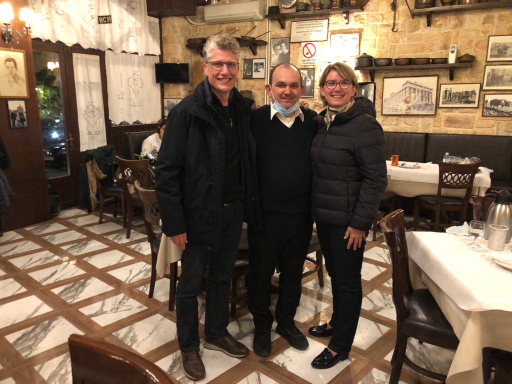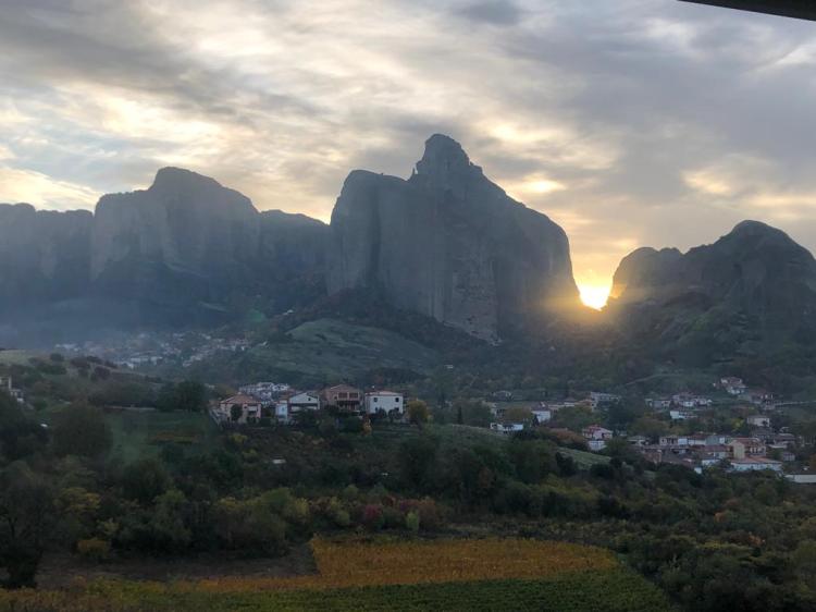 Pour le dîner, nous fuyons l’hôtel. Avec 5 chambres occupées sur 200, ça sent les plats congelés à plein nez. Vu la taille du village dont 80% de l’économie doit tourner autour des Météores, nous nous rabattons sur la suggestion d’un blog et suivont la bonne note de Google. Direction le Panellioni à Palampaka. Le restaurant est typique et sympa. Il est bien trop tôt pour les grecs mais le restaurateur nous accueille quand même à 19h15 : un horaire de hollandais ! On se régale d’une moussaka et d’aubergines farcies arrosées d’un vin rouge de Thessalie correcte.