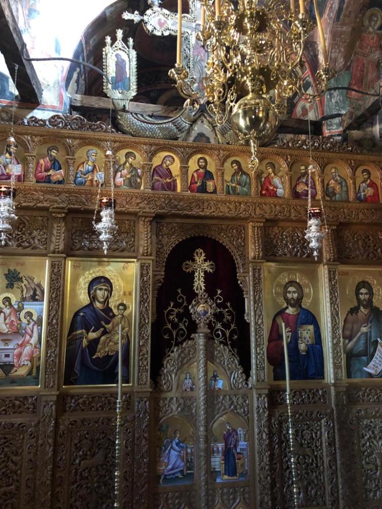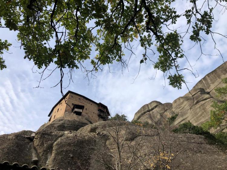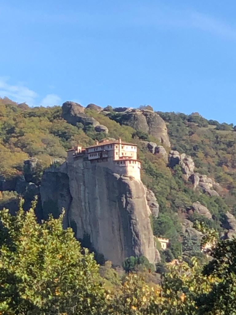 A partir d’une lecture d’un blog, Sophie apprend qu’il y a d’autres monastères plus modestes mais accrochés dans la falaise à moitié troglodyte. Nous déposons donc la voiture sur le petit parking du monastère de Agios Nikolaos ou St Nicholas (le premier sur la route escarpée des Météores) et entamons les 30mn de marche pour partir à la découverte du monastère d’Ypapantis. Il n’est pas ouvert au public. Il n’y a d’ailleurs pas de public : nous sommes juste avec un autre couple de français. C’est magique. Pour le retour, nous empruntons un sentier utilisé par le MRT ou Météores Running Trail de Kalampaka pour rejoindre le point de départ : nous sommes en pleine forêt, au milieu des chênes avec pour seule compagnie les météores qui nous surplombent à gauche et les cloches des troupeaux de brebis à droite. Ça nous rappelle notre Chemin de Compostelle 🤗