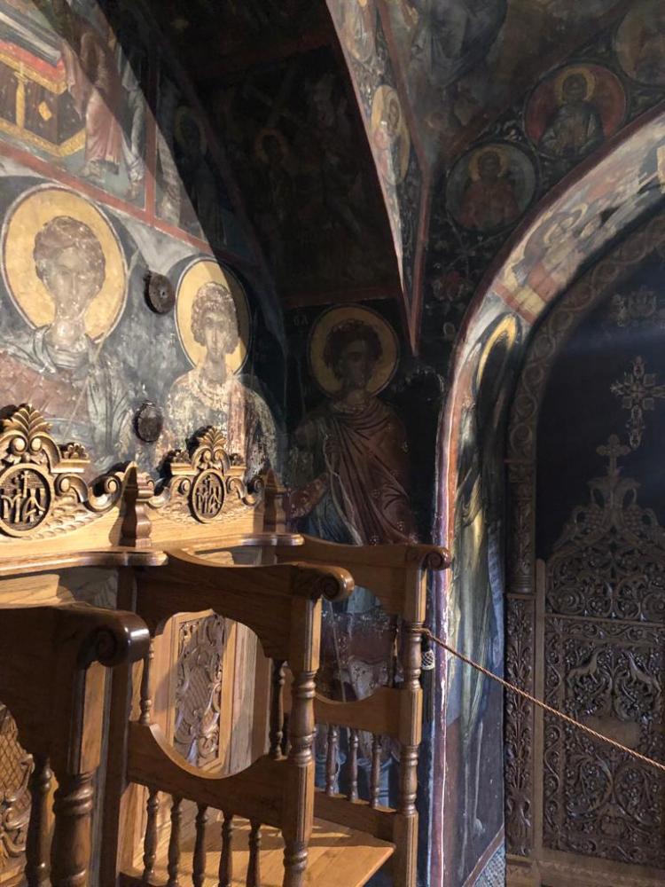 Il y en eu jusqu’à 22 mais il n’en reste désormais plus que 6. Cela ressemble à des places fortes, entièrement dédiées au culte dont 4 sont habités par des moines et 2 par des nonnes. Ce qu’ils ont réussi à faire et à entretenir est juste impressionnant. Ces monastères sont perchés au sommet de falaises, agrippés on ne sait comment, quasi au-dessus du vide. Pour y accéder dans le passé, le seul moyen était l’échelle de corde ou le filet hissé par un treuil. Les moines ont également taillé la roche pour y faire des escaliers. Mais l’accès aux monastères reste protégé par de lourdes portes métalliques ou des ponts-levis. L’accès est soumis à une obole modeste (3€ par adulte en cette basse saison ou gratuit si on est un prêtre orthodoxe. Nous, nous avons payé !). Mais le prix n’est pas l’unique condition : les hommes doivent être en pantalon et les dames en jupe cachant les genoux. Sophie avait prévu le coup et a enfilé une jupe longue élastique, caractéristique plutôt commode pour monter au sommet des monastères (en pratique, des jupes ou des pareos sont prêtés à l’entrée pour les dames).