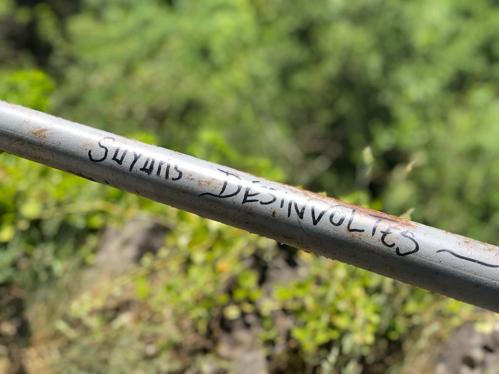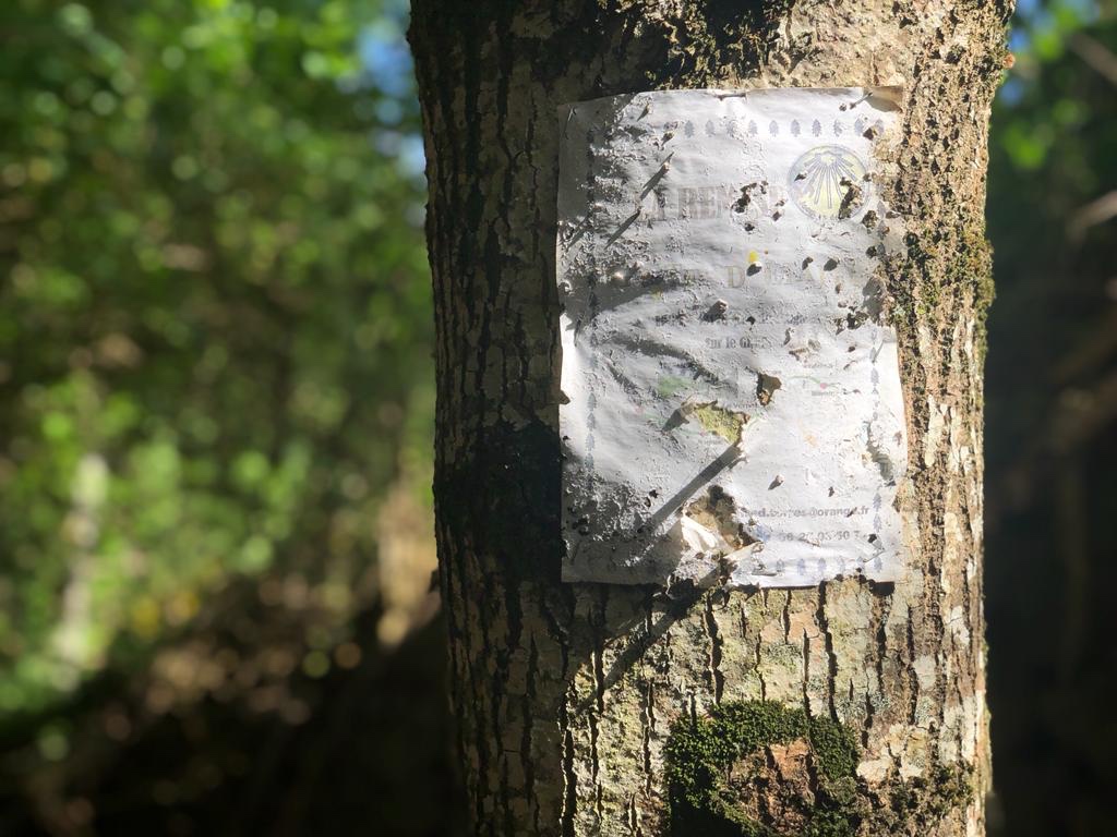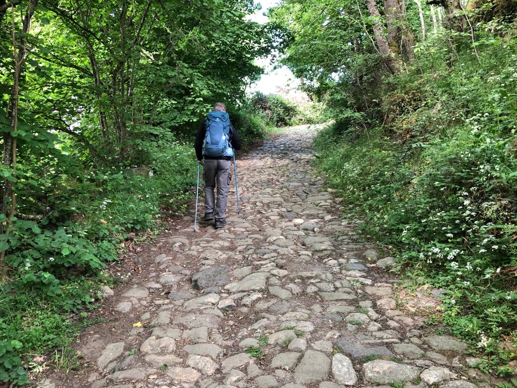 Singularité du jour : après une bonne montée de quelques centaines de mètres bien cassante, une fontaine est disponible pour se rafraîchir. Un gars en profite pour se… raser ! On n’a pas bien compris pourquoi à 12h20, au milieu du Chemin il avait besoin de se raser là, ici et maintenant à l’eau froide 🤔. On sourit, on dit bonjour et on avance. Quelques minutes plus tard, dans la montée, le pic-pic classique des bâtons résonnant sur le bitume nous alerte d’un déplacement rapide. Le « rasé de près » arrive à notre hauteur avec deux sacs, un dans le dos et celui de son épouse sur le devant. Nous commençons à discuter.