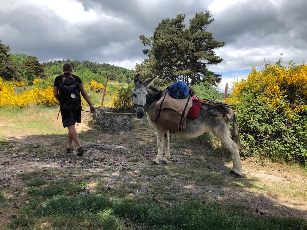 Nous avons décidé de terminer la montée qui nous a bien pris deux heures avant de faire la pause casse-croûte du midi-13h (les saucissons-ficelles de notre charcutier étaient délicieux). Un marcheur passe avec son âne qui décide de s’arrêter roupiller 5mn juste à notre niveau (l’âne, pas son maître car lui tient la longe en attendant que Nanou se décide à repartir). Le gars et son âne vont à St Jacques. Ils sont partie de Savoie et ont déjà 400km au compteur tous les deux. Respect.