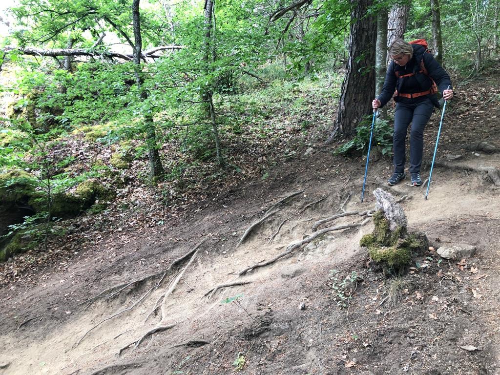 Au moment de l’échauffement, on entend clac clac clac sur la carrelage sur couloir, comme si l’on tirait des valises à roulettes. Mais qui peut bien marcher avec des valises ? A la réflexion, nous nous souvenons que des tour opérateurs organisent des transferts de bagages entre les étapes. On se demandait aussi pourquoi une dame portait un jean blanc et une ceinture Hermès au dîner ! Cela détonnait un peu dans l’ambiance gîte communautaire (salade de lentilles à partager, « allez, renvoyez les assiettes en pile au bout de la table ! » nous ordonne notre hôte).