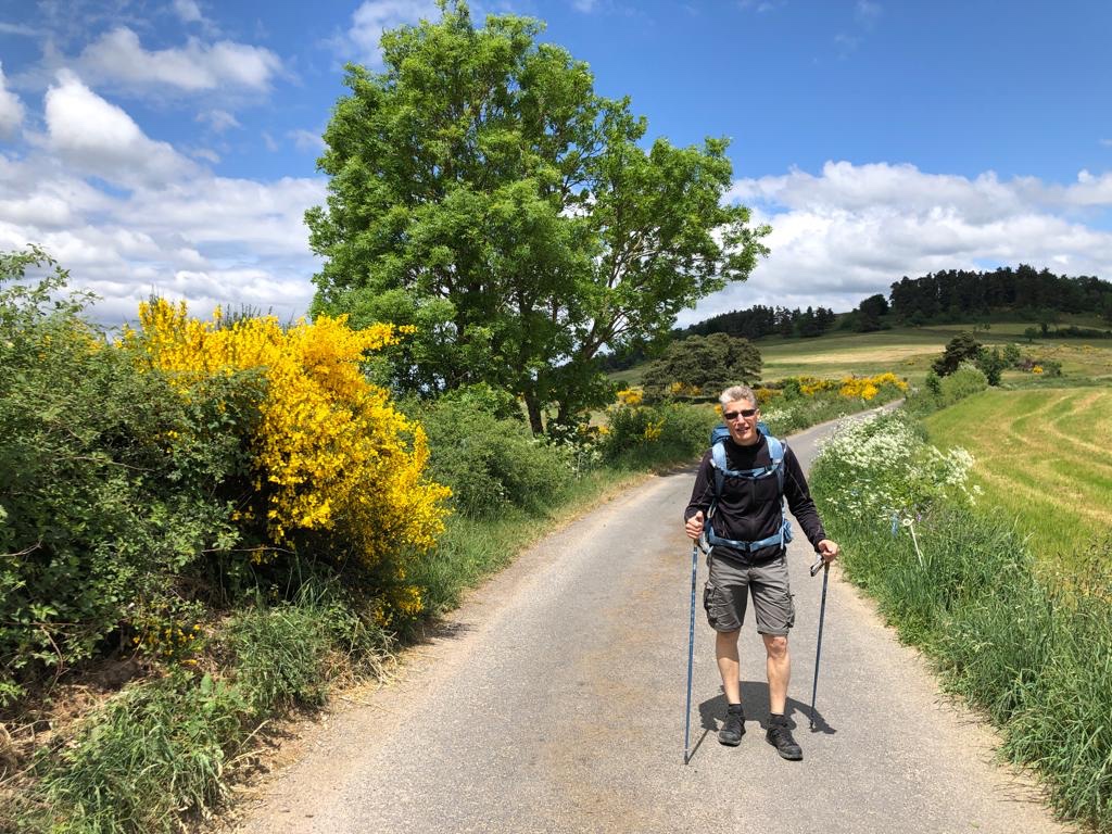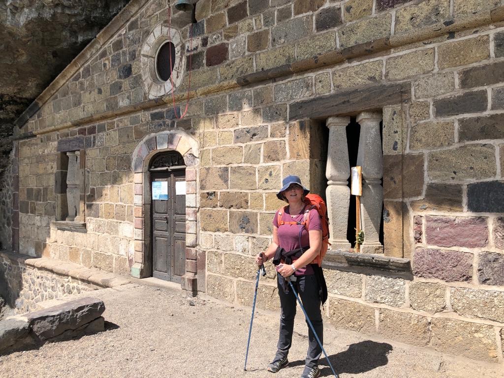 On passe et on repasse un jeune couple dont la fille semble tirer la patte. On marche un peu ensemble et on se met à échanger. Elle n’est pas du tout sportive, ne s’est pas entraînée et a acheté ses chaussures quelques jours avant. Donc, son corps lui fait payer du style « toi, tu ne fais rien de l’année et là tu me malmènes en marchant 20km ! Je vais t’expliquer qui est le patron » (ça c’est son corps qui lui parle). Finalement, en bons samaritains que nous sommes, nous finissons la dernière heure avec le jeune couple. Je tchatche avec Simon (qui est déjà allé à St Jacques en vélo) et Sophie avec Amandine, histoire de lui changer les idées et qu’elle pense moins à sa sciatique dans la fesse. Et bien ça marche ! Elle était radieuse arrivée à Saugues mais pas guérie. C’est la bienveillance du Chemin mais pour les miracles, la direction c’est Lourdes.