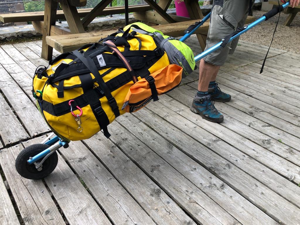 Ce matin, nouvelle découverte technique. Après notre hollandais d’hier et sa charrue de 60kg, ce matin nous découvrons Pascal et son Carryx. C’est une sorte de charriot à une roue (petite comme celle d’un scooter) que le monsieur s’accroche à un harnais pour porter environ 20kg de matériel. Sur ce tronçon jusqu’à Conques ils dorment en gîte mais dès que la chaleur va monter, ils ont prévu d’être en autonomie jusqu’à Ronceveaux puis ensuite de rejoindre Biarritz. Belle virée de retraités !