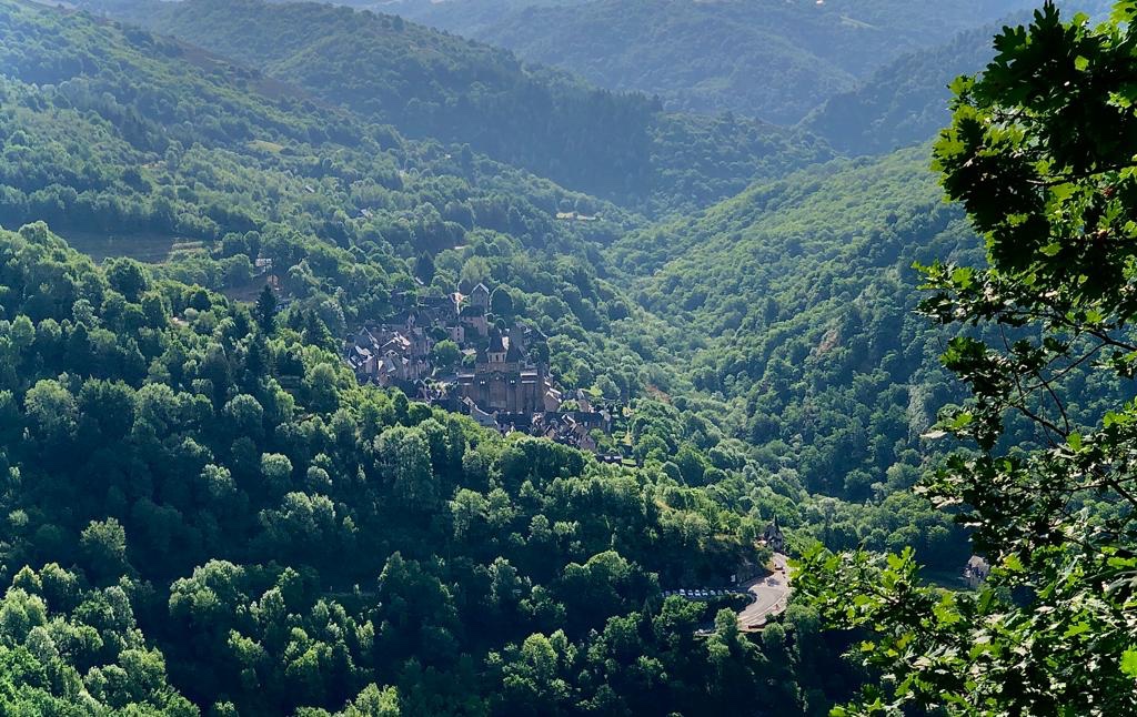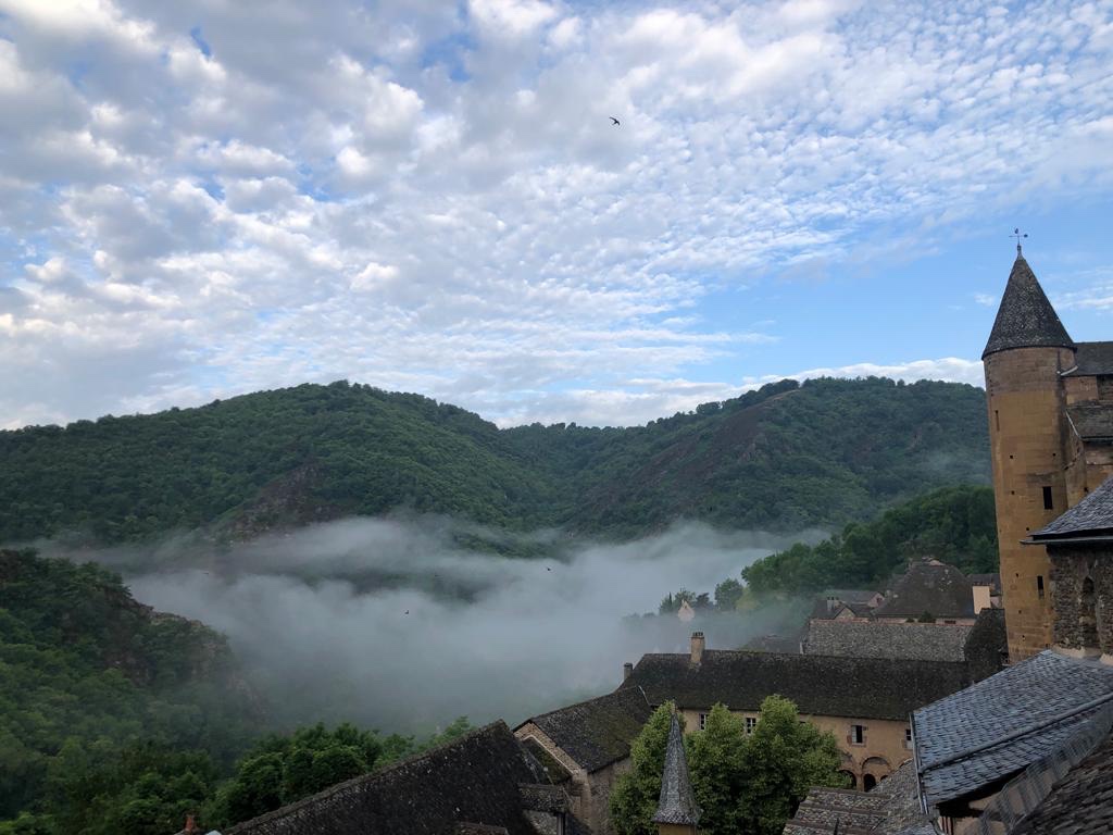 Après le reste de la nuit qui a bien rafraîchi l’atmosphère, la vue du village de Conques avec le brouillard dans la vallée est juste magnifique. Comme pour le repas, le petit déjeuner est d’une qualité de colonie de vacances, mais c’est loin des standards de consommation d’énergie des marcheurs. Pourtant la descente de Conques et la remontée sur le plateau sont très costauds.