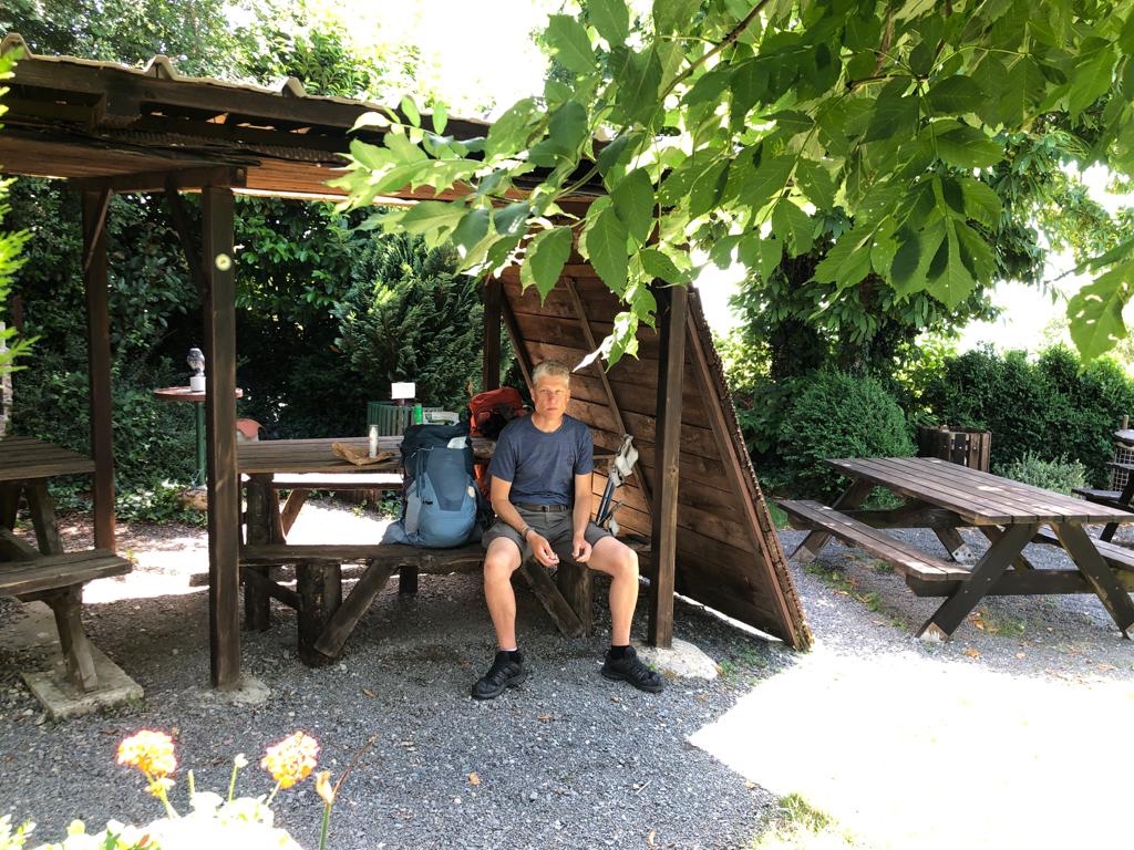 Un couple nous croise et n’ose pas nous dire bonjour. Ils passent leur chemin. Nous reprenons le nôtre. La chaleur est harassante. Une halte au joli nom de Fonteines (et non pas fontaine) s’offre à nous et à tous les marcheurs du jour. Un papy a organisé un petit jardin avec des tables et des toits pour s’abriter du soleil. Il propose une fontaine d’eau et du café en mode Donativo : chacun se sert et met ce qu’il veut dans une boîte. Cela fait 10 ans qu’il a installé cet havre de paix. Il est passé au journal télévisé local et a eu le droit à un article de presse. C’est un point incontournable entre Conques et Decazeville.