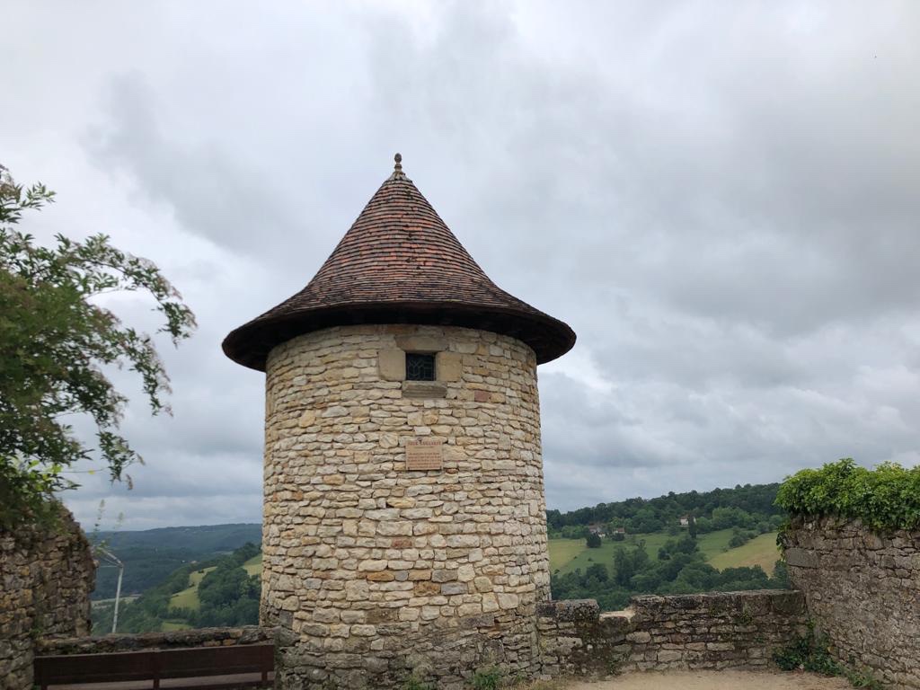 Ces discussions dans le Quercy permettent à Sophie de finir son étape avec son attention déviée des douleurs de ses talons toujours plus vives en fin de journée qu’au début. Nous tombons sur la vallée de Cajarc en la découvrant du haut de ces falaises qui dominent le Lot. Ce village de 1000 âmes était le lieu de naissance de Françoise Sagan et de villégiature du président Pompidou. Mais le village a été aussi mis sur le devant de scène par Coluche et son fameux sketch de 1976 sur Le Schmilblick de passage à Cajarc.