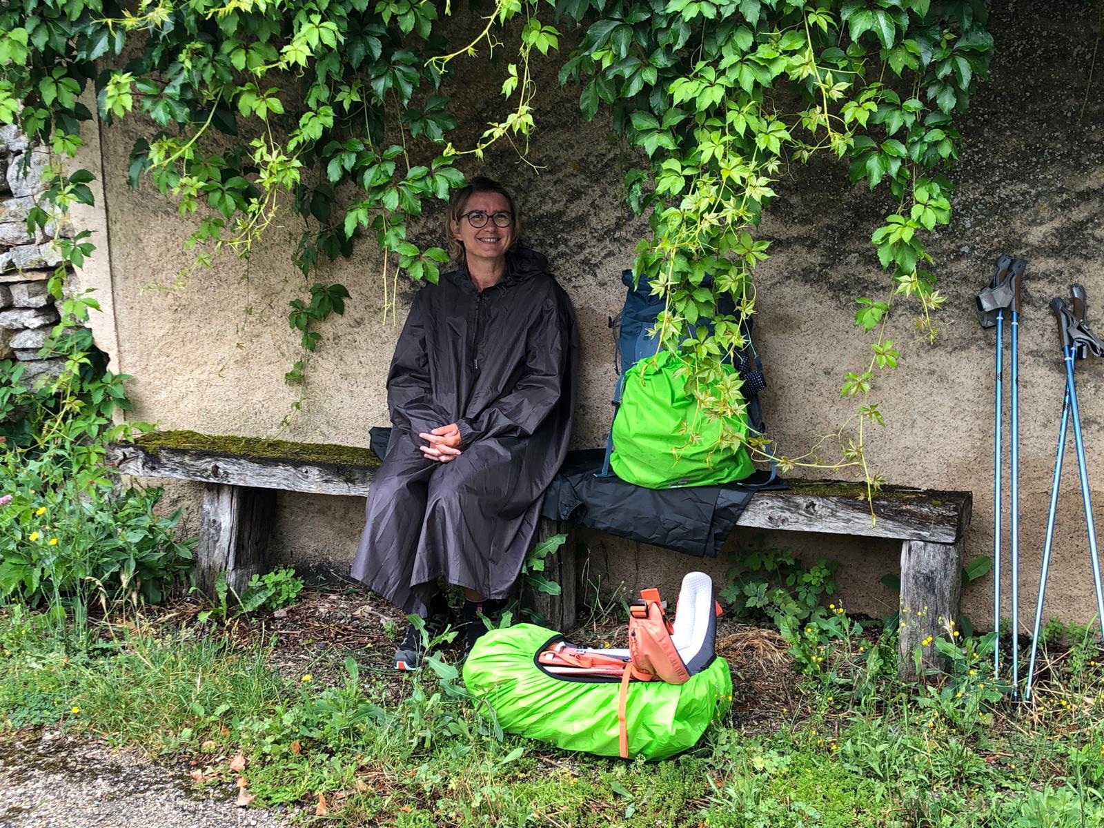Cette halte nous sert de pause déjeuner : au menu, dégustation du farçou, spécialité de la région. C’est une délicieuse, quoiqu’un peu grasse, galette de blettes rissolée que nous mangeons froide avec une tranche de jambon de pays exactement comme on nous l’a recommandés. Ça tient au corps. Nous rencontrons alors un couple un peu fatigué qui a pris une variante sans faire attention et a marché 1h30 de plus dans la mauvaise direction. Ils ont heureusement trouvé un local sympa qui les a ramenés en voiture au village. Mais à 13h, ils ont du coup encore cinq heures de marche avant d’atteindre l’arrivée de leur étape. La journée va être très très longue et difficile avec une jambe qui semble traîner un peu.