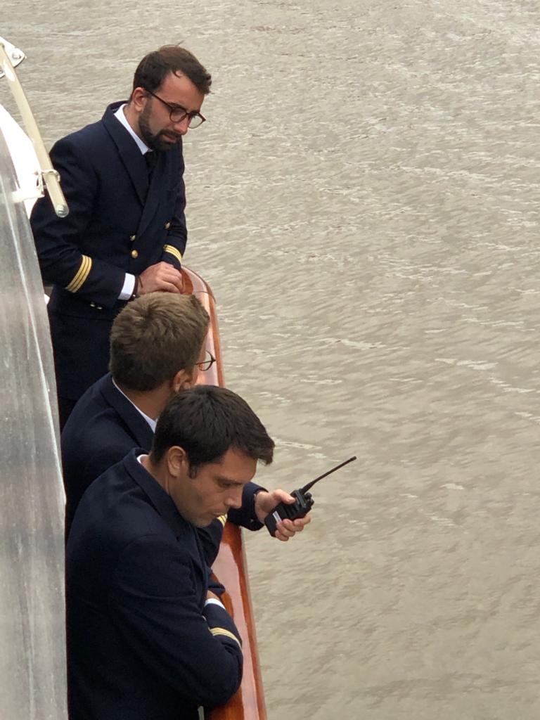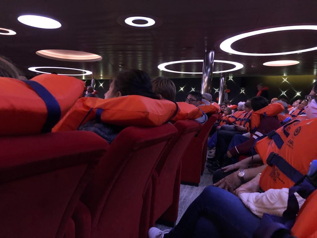 Ensuite, nous enchainons avec l’exercice d’abandon du navire, lui aussi obligatoire. Après avoir entendu la sirène d’alerte (7 coups courts et un coup long), nous regagnons notre cabine, tentons d’enfiler notre gilet de sauvetage. Nous regagnons le lieu de rassemblement pour nous assoir bien les uns à la suite des autres non sans avoir été séparés en deux groupes distincts (selon le chiffre sur notre filet) afin d’être répartis dans des chaloupes (ça, on ne le fait pas mais on passe dessous quand même pour voir où elles se trouvent). C’est très sérieux et ça nous met une pointe de Titanic dans la tête. Pas un truc pour notre ami Loys ça !
