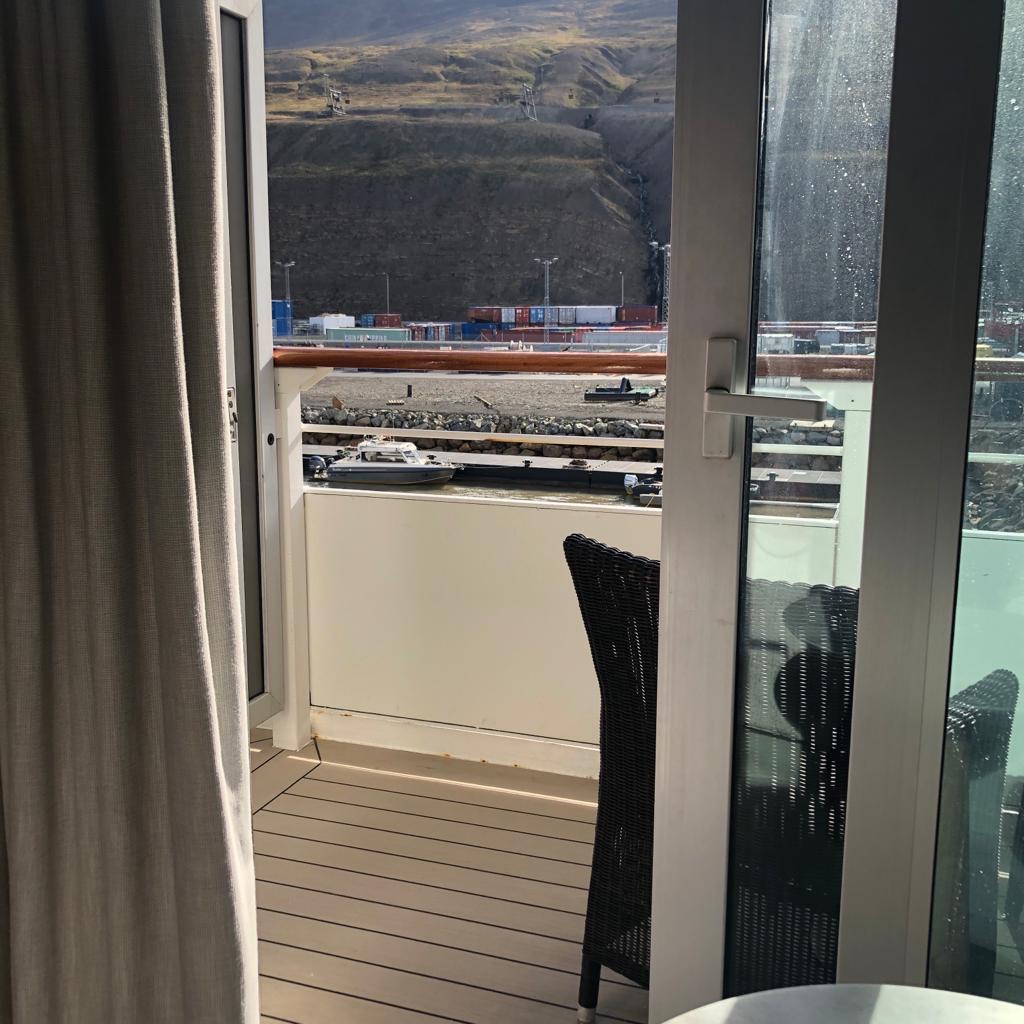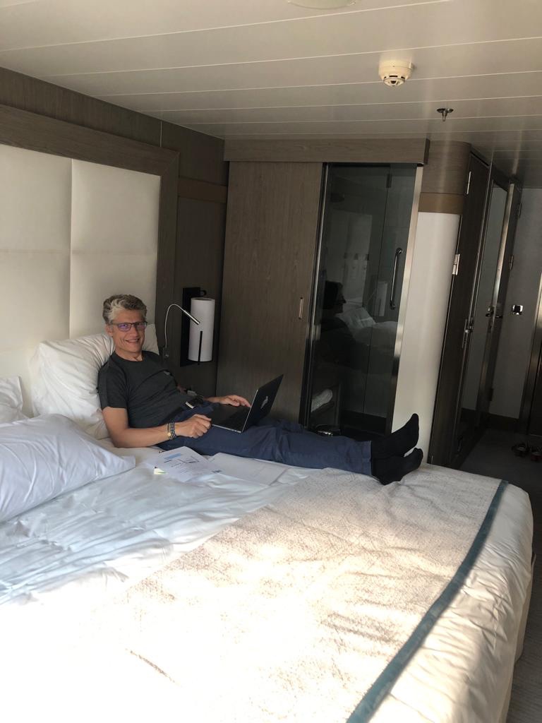 Le bateau est magnifique, ultra raffiné et très chic. Toute la déco est harmonieuse, les couleurs douces et reposantes, relevées de-ci de-là par une pointe de rouge vif très discrète. Après la serviette chaude, nous sommes accueillis par le commandant et une coupe de champagne le temps de faire les formalités : dépôt du pass sanitaire et du test PCR, du passeport (c’est une obligation ici en cas de contrôle portuaire…mais il n’y a plus de port) et la prise de photo. La chambre (oops, pardon) la cabine est superbe, très spacieuse avec plein de rangements, une belle douche dans un tel espace, une literie ultra confortable et, cerise sur le gâteau, un balcon pour profiter pleinement du paysage.