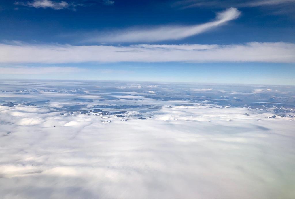 Nous suivons la route prise par le Commandant Charcot, qui a rejoint le pôle nord sur sa goélette en 1908-1910. Cela secoue un peu en longeant les côtes. Pour la première fois, j’entends un pilote nous commenter les éléments techniques du vol : masse au décollage, quantité de kérosène embarqué. Rigolo.