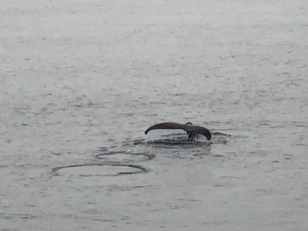 Katia fait une demande à tous les passagers munis d’appareil-photo à peu prêt sérieux. Le challenge est de photographier la nageoire codale (enfin la queue pour les amateurs…) mais pas n’importe comment : il faut qu’elle soit bien perpendiculaire au niveau de l’eau et que l’on voit le dessous, sorte d’empreinte digitale du mammifère. Et tout ça pour renseigner le site HappyWhale, sorte de Facebook de toutes les baleines du monde, pour les identifier, les recenser et visualiser leur parcours entre les eaux chaudes où elles mettent bas et les eaux froides des pôles où elles viennent manger (pas dans la même journée, je rassure notre aimable lectorat mais à chaque saison). Je tente de me mettre dans le lot des photographes mais je dois admettre que mes photos iphonisées sont trop pixelisées et ne pourront servir que très modestement (ou pas du tout) à l’avancée de la science. Laissons faire les pro qui sont venus avec des téléobjectifs de 50cm de long.