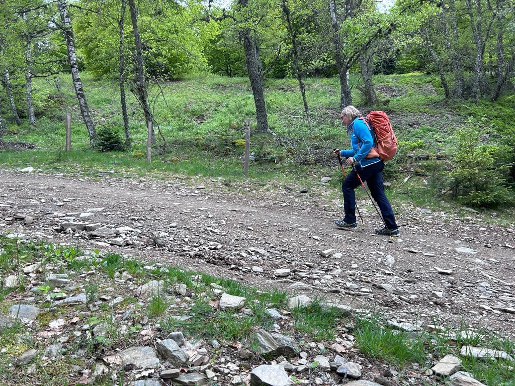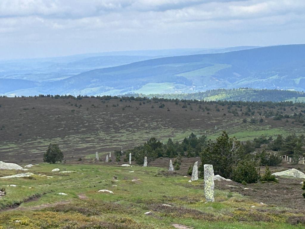 Comme nous avons une micro étape d’à peine 10 km, nous ne sommes pas pressé ce matin et prenons notre temps pour continuer d’admirer le paysage. Cette petite randonnée n’a pas été choisie mais a été imposée par la difficulté de trouver des hébergements sur la traversée du Mont Lozère. Toutes les autres personnes qui étaient avec nous hier soir franchissent cet obstacle d’une seule traite et vont tous enquiller entre 25 et 35 kilomètres. Notamment un monsieur canadien du Yukon, au nord-ouest du Canada juste avant l’Alaska. Il est français installé là-bas depuis 40 ans et ne quitterait ses -40 degrés l’hiver pour rien au monde. Par contre, pour lui, seule la France offre un tel éventail de chemins pédestres. Son ami québécois confirme que chez lui, les parcelles de terre entre propriétaires ne disposent pas d’espace libre laissé aux troupeaux (usage premier) puis au marcheurs (marchands à l’époque lointaine et randonneurs aujourd’hui).
