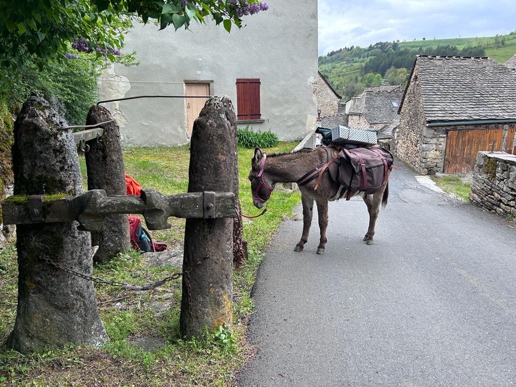 Comme nous avons le temps, nous flânons en ville et rencontrons Patrick et son âne Hector. C’est la pause énergie : Patrick sort un sac Favrichon (mes céréales bio) et donne à son âne un cocktail détonnant. Le baudet devait être au refuge du Mont Lozère pour midi. Il est arrivé à 16h. Il n’en a fait qu’à sa tête (l’âne pas Patrick) et est même reparti en arrière, stoppé par des randonneurs plus bas. Ils devaient passer le Mont Finiels ce jour : ils le passeront demain avec nous.