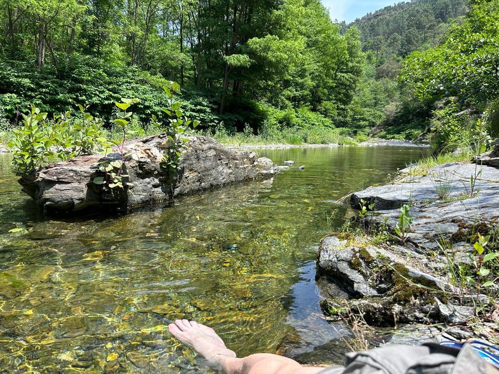 Nous décidons de passer le temps jusqu’à l’heure d’arrivée, fixée à 15h : je fais trempette dans la rivière qui coule dans la vallée ; l’eau est fraîche mais le croassement des grenouilles et l’écoulement de l’eau sur les cailloux rendent ce moment frais et reposant.