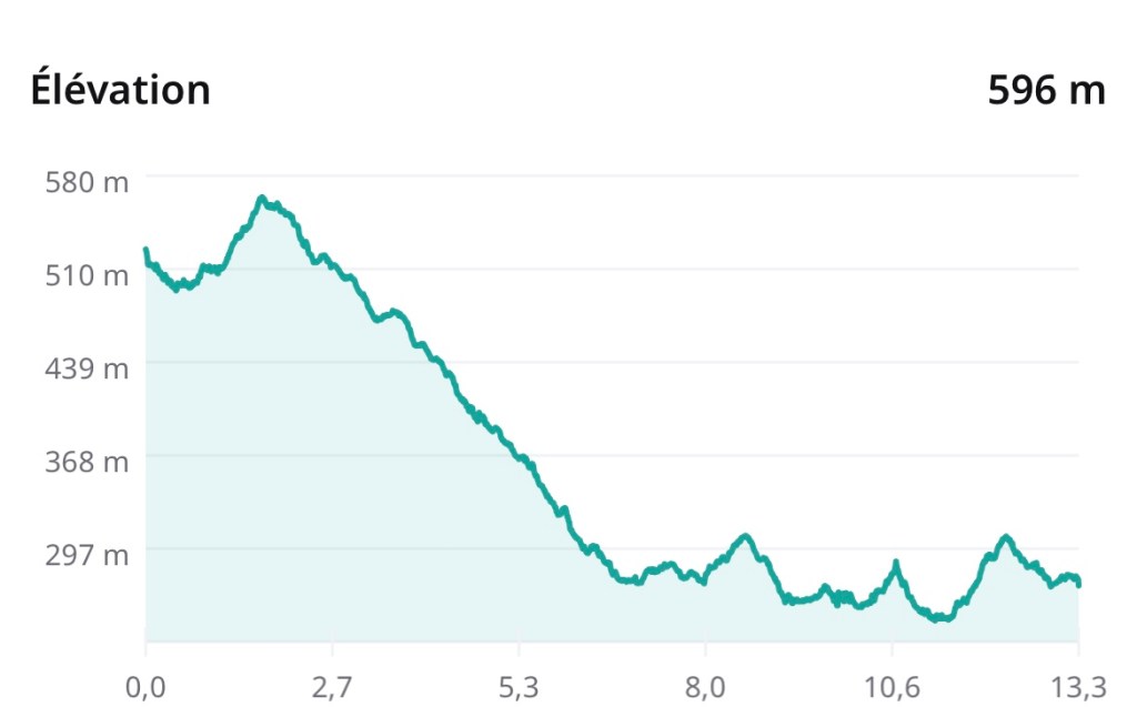 Nous passons devant notre gîte d’étape, qui se trouve à 1,7 km du village. Fait exceptionnel : nous décidons d’aller déjeuner dans un bistrot. On n’aime pas trop passer une heure à table : on mange trop et ça casse le rythme ; comme on n’a pas de rythme aujourd’hui, vu que l’on se promène, on n’en profite.