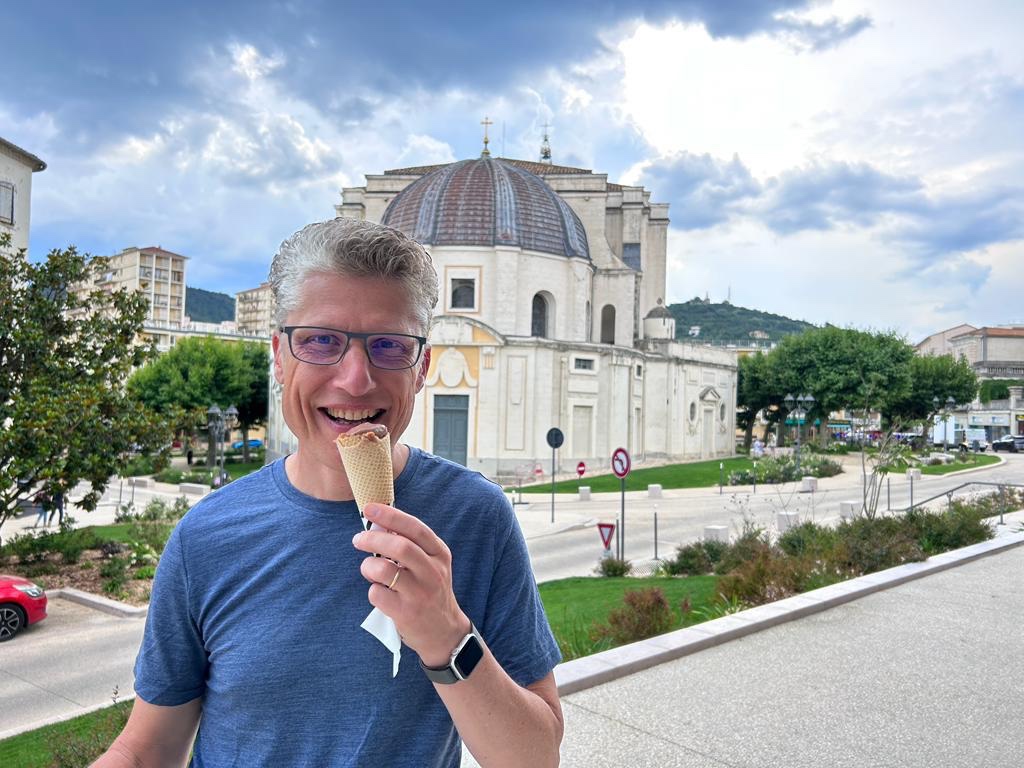 La route des crêtes n’a pas usurpée sa réputation : c’est caillouteux à la montée comme à la descente. Il faut même faire des blocs (comme en escalade) en retirant les bâtons plusieurs fois afin de passer les descentes à la façon Saint Privat d’Allier (Sophie et Vaness s’en souviennent) mais sur 5 km ici. Fin de parcours exigeante. J’aurais mérité ma glace !