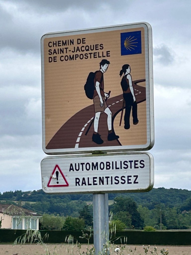 Comme souvent aux abords des routes bitumées, les départements installent des panneaux avertissant les automobilistes de faire attention au marcheurs de Compostelle. À bien regarder l’illustration, on peut voir que l’homme porte un gros sac et la femme un tout petit. Nous trouvons cette image bien sexiste, sachant qu’il y a beaucoup plus de femmes qui marchent sur le chemin que d’hommes, et pour la très grande majorité, portent leur sac aussi gros que celui des hommes. #metoo