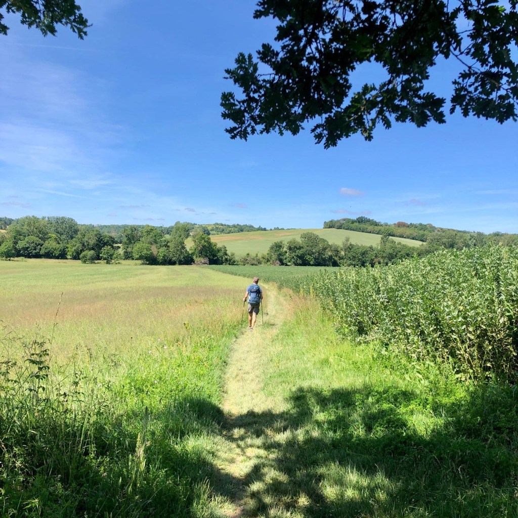 Il est dit qu’il faut entre 3 et 7 jours pour prendre le rythme du Chemin. On en est au 7e ce matin et ça va mieux enfin presque : ça tire toujours fort dans les pieds et les genoux pour Sophie, et la tête, allouette ! Ma pointe musculaire dans le dos se désagrège gentiment après les massages à la Lili de Sophie (je crie pareil et ça fonctionne). Bref, on commence à prendre le rythme du Chemin.