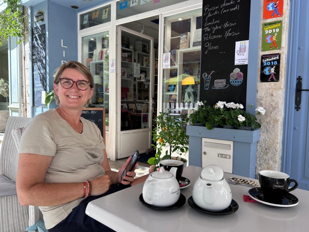 L’avantage d’avoir une étape courte est de nous poser, profiter d’une glace, déambuler en ville et boire un thé au Cochon Bleu, librairie-salon de thé, halte obligée pour Sophie.