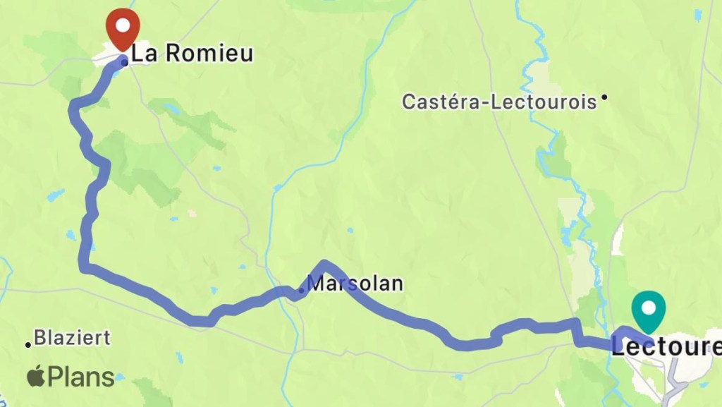 La nuit fut compliquée, surtout le début. Sophie a mal aux pieds, ce qui la handicape notamment pour se re-déplacer quand on est arrivé. Je suis à la recherche de solutions alternatives pour qu’elle puisse faire les 20 km du jour sans marcher. Mais aucune offre de transport public n’existe pour relier Lectoure à la Romieu. Je m’inscris même à BlaBlaCar à 1h du matin. Mais après une dose de CBD la veille au soir, Sophie part bon pied-bon œil pour 19km.
