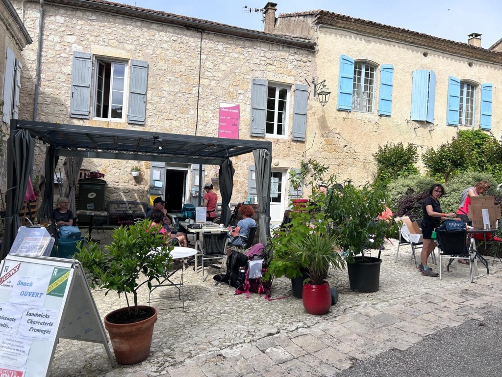 Marsolan, micro village, qui ne vous dit rien, mais qui se trouve idéalement placé à 9 km du départ : autant vous dire que tous les marcheurs s’arrêtent pour faire une pause, boire un café, acheter les sandwiches. Il y en a même deux qui se délestent de leur trop-plein. Il se trouve que le café du village fait aussi relais Colissimo. Elles en profitent pour se peler et envoyer des colis chez elle du trop plein emporter par peur de manquer mais qu’il faut porter. On n’en avait toujours entendu parler mais on ne l’avait jamais vu.