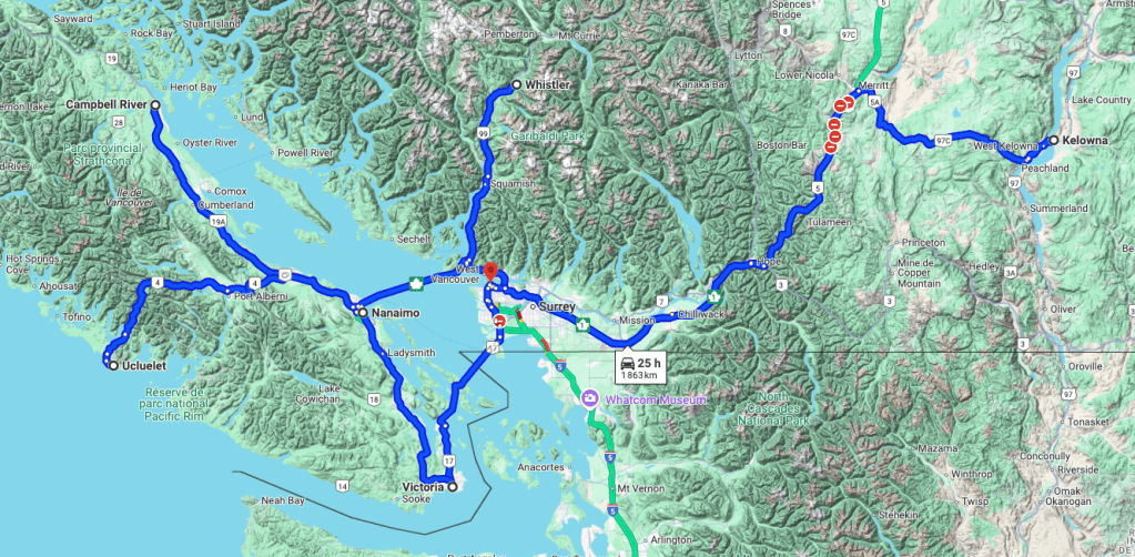 Donc, le 18 avril, nous commencerons un road trip comme on les aime de 1700 km en 10 jours à découvrir les beautés de l’île de Vancouver jusqu’aux Rocheuses :
