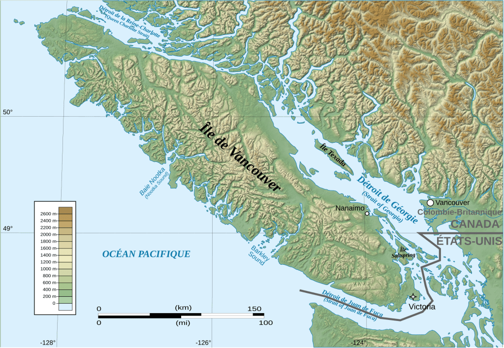 Accrochez-vous : ça se complique. Nous atterrissons à Vancouver pour aller rendre visite à Charles qui étudie à Victoria sur l’île de Vancouver. Vous y êtes ? Non ? Bon alors je zoom ++. Cela sera plus clair.