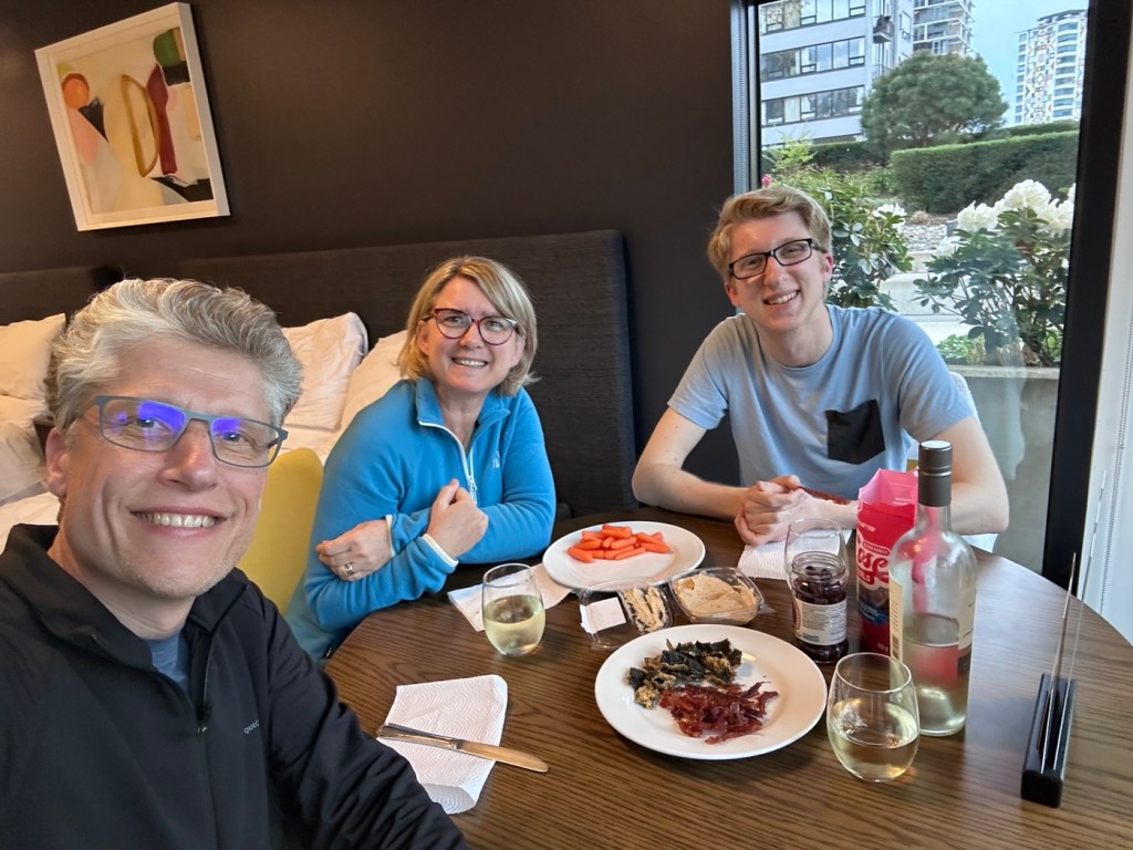 Malgré le voyage plutôt matinal, nous voici arrivés à Vancouver où nous retrouverons Charles après quatre mois de séparation. Il nous attend à l’aéroport en ayant fait le trajet depuis l’île de Vancouver en hydravion (expérience sympa, quoi qu’un peu stressante avec une arrivée en piqué). Le temps est magnifique et la vue sur les montagnes enneigées est sublime.