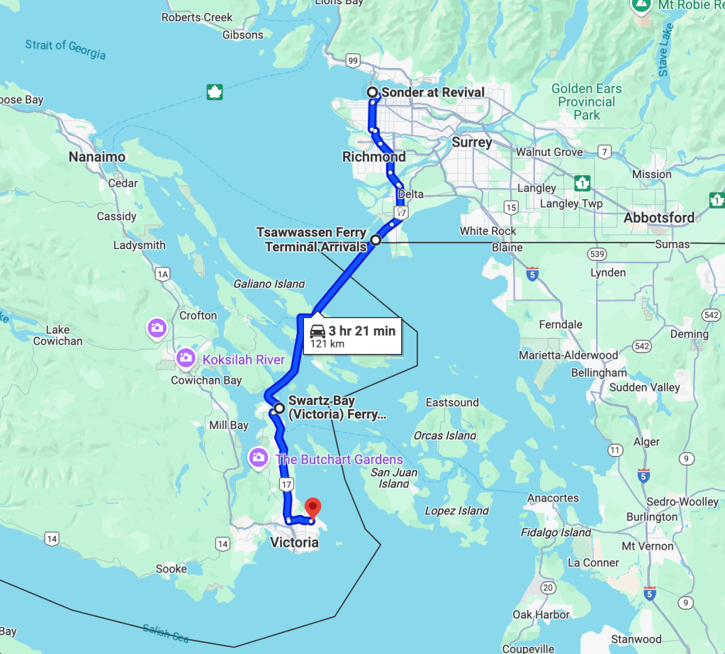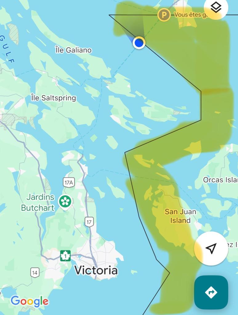 C’est aujourd’hui le début du Road trip au Canada. Nous quittons Vancouver pour rejoindre le terminal d’embarquement du ferry à destination de l’île de Vancouver. L’attente est un peu longue dans la file de voitures mais l’embarquement est ultra rapide. Il faut maintenant patienter 1h30 à bord en traversant une toute petite partie des États-Unis (partie colorée en jaune sur la carte). Notre accent français attire un Acadien qui semble content de parler avec nous.